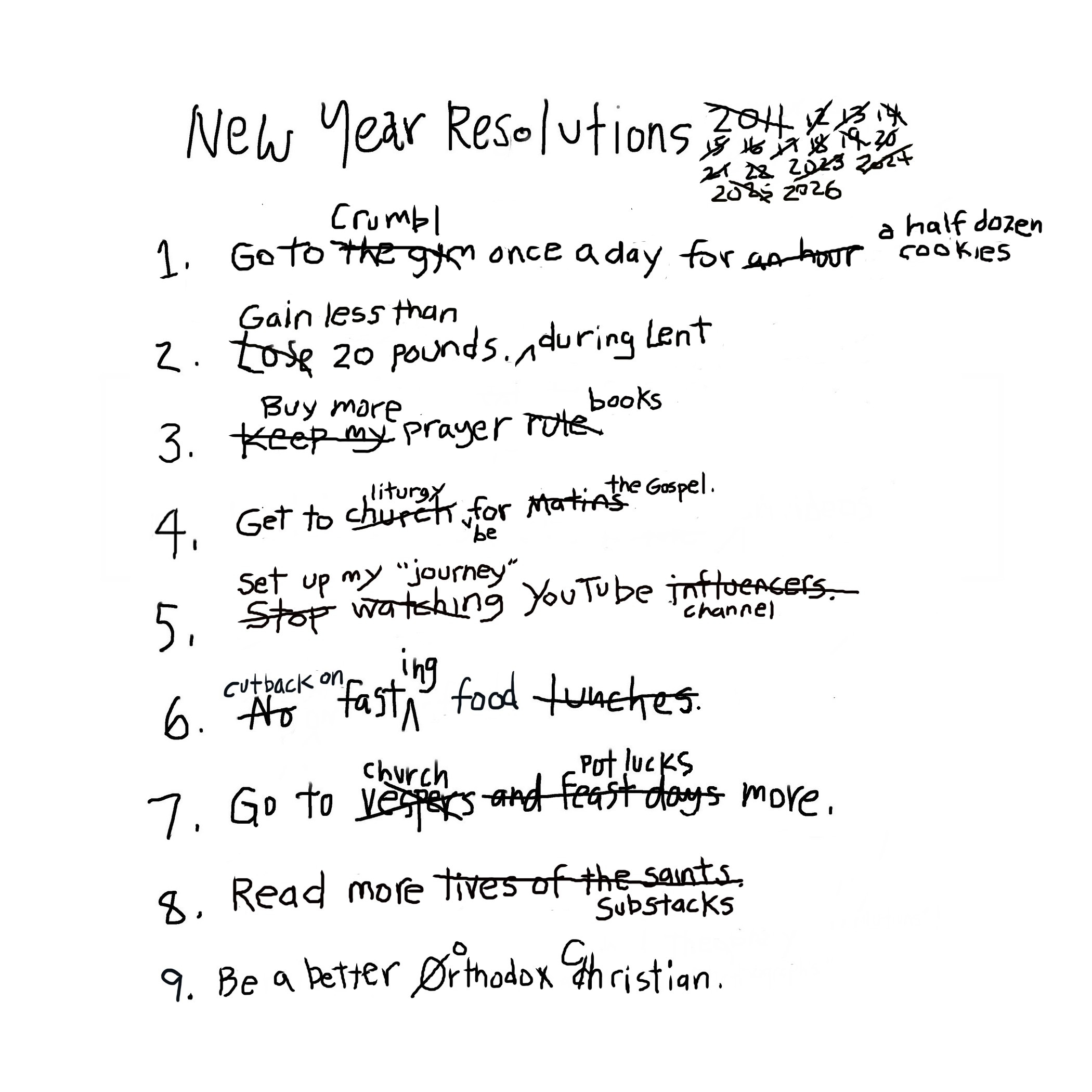 Fifteen years ago I drew the first “Orthographs” New Year’s Resolutions. I slightly revised one or two resolutions every year to include some current event/cultural references. This year is the first major revision of the list.